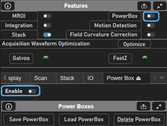 Finally, to enable power boxing, click the switch either in the Features panel or at the top of the Power Box tab. Acquisitions started with power boxing enabled will use P0s as configured.