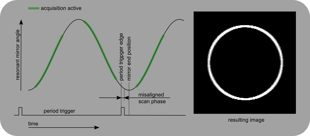 The scan phase is the time difference between the period trigger edge and the maximum deflection of the resonant scanning mirror