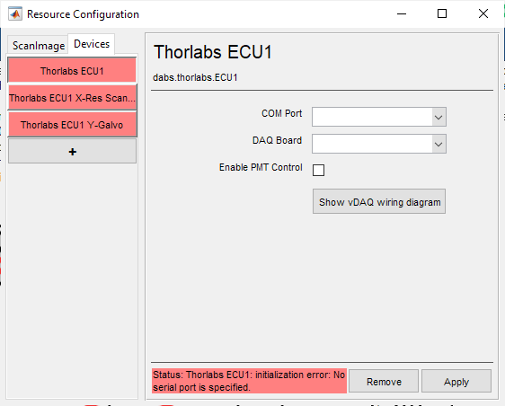 In ScanImage, open the Resource configuration window from the startup dialog or from the Main Controls window under File>Configuration.